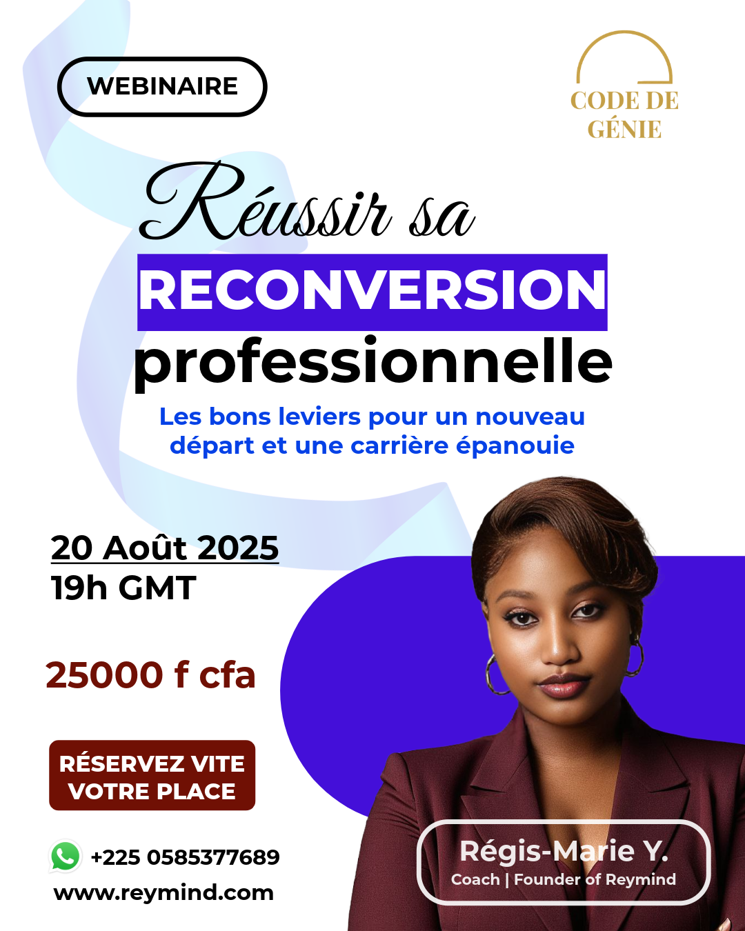 Rejoignez Régis-Marie, fondatrice de Reymind, elle vous partagera une feuille de route éprouvée pour reprendre le contrôle de votre avenir professionnel.
